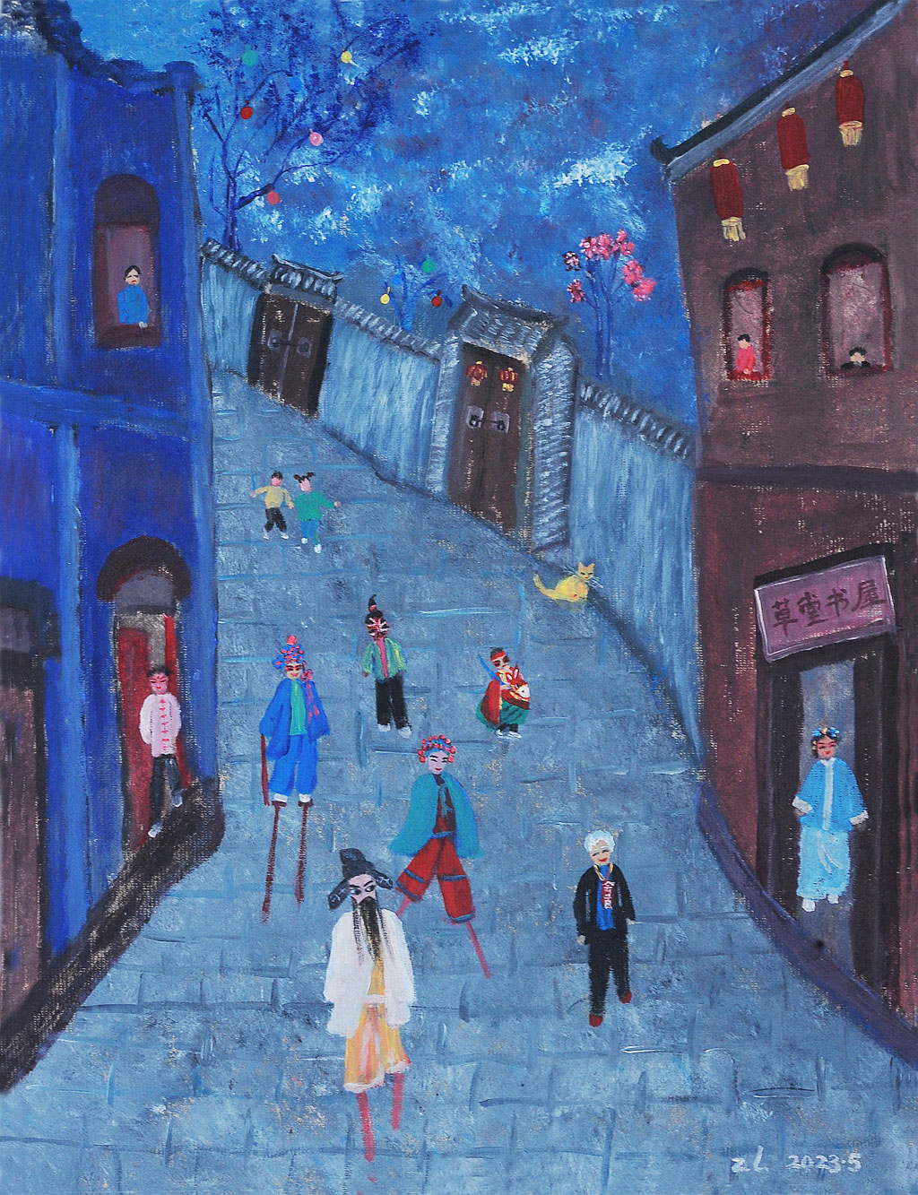 喜欢画画了,也就很自觉的去看画读画,读了很多中外名人的画,最最喜欢夏加尔的画,我看了夏加尔很多很多的画,我觉得夏加尔的画自由浪漫并且充满了爱。夏加尔说过一切都源于爱,我画画也是因为爱。从15年到现在我画了有几百幅画,<正月>是其中的一个系列.画于与2023年.